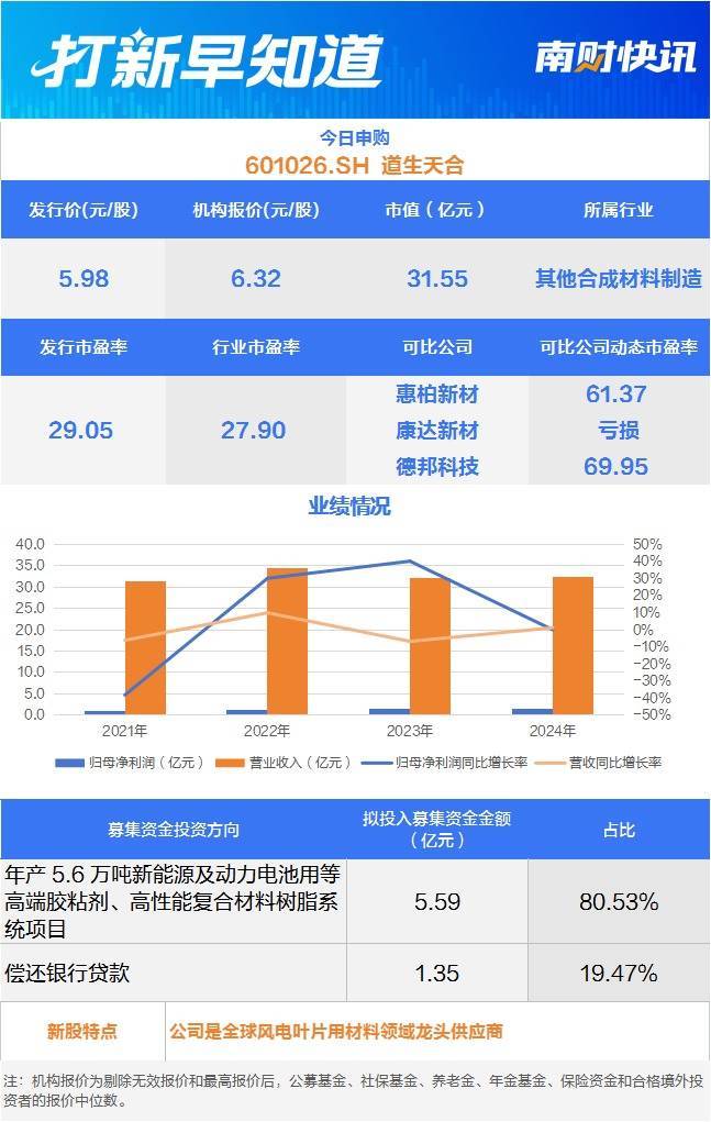 9月29日,有一只新股可申购,为沪市主板的道生天合(601026.SH)。该公司是一家致力于新材料的研发、生产和销售的国家级高新技术企业。产品主要围绕环氧树脂、聚氨酯、丙烯酸酯和有机硅等高性能热固性树脂材料,形成了风电叶片用材料、新型复合材料用树脂和新能源汽车及工业胶粘剂三大系列产品。